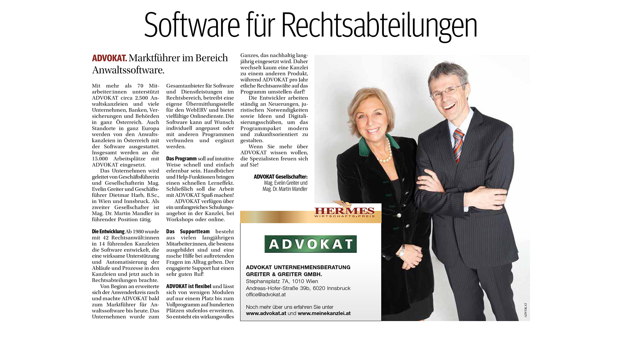 Der Austrian`s Leading Companies Award (ALC) wurde dieses Jahr zum 25. Mal verliehen und seit 2016 sind wir jedes Jahr unter den Besten dabei. Im November wurden in der Hofburg Wien die besten Unternehmen Österreichs ausgezeichnet. Mag. Evelin Greiter (geschäftsführende Gesellschafterin) und Mag. iur. Fabian Wiesner (Verkaufsleiter) waren dabei, als ADVOKAT sich auch 2023, zum wiederholten Mal, einen Spitzenplatz sichern konnte. Nach den strengen Wertungskriterien des KSV1870 der „Die Presse“ und der „PwC Österreich“ rangiert ADVOKAT auf Platz 26 in der Kategorie „Österreichische Mittelbetriebe“!