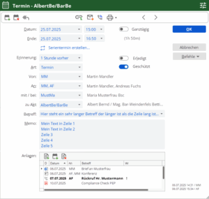 Komplexe Termine lassen sich nun noch besser strukturieren. Mit Sub-Terminen und integrierten Aufgaben können einzelne Arbeitsschritte klar definiert und zugeordnet werden. Dadurch behalten Sie auch bei umfangreichen Vorgängen stets den Überblick über offene Punkte, Zuständigkeiten und Fristen. Der Terminkalender wird so zu einem zentralen Steuerungsinstrument für Ihre tägliche Arbeit.