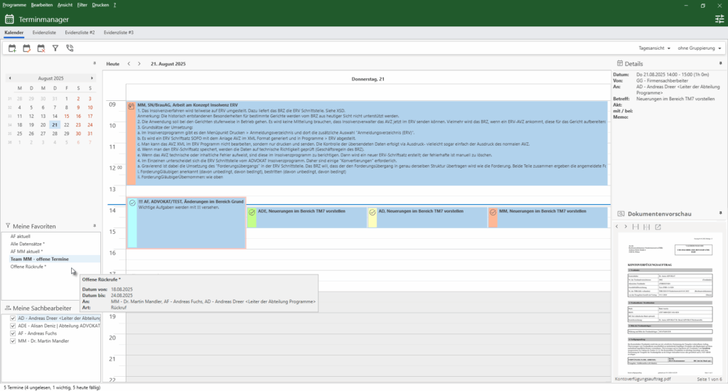Ein strukturierter und zuverlässiger Terminkalender ist ein wichtiger Bestandteil eines reibungslos funktionierenden Kanzleialltags. Genau aus diesem Grund wurde unser Terminkalender von Grund auf neu konzipiert und technisch wie gestalterisch weiterentwickelt.